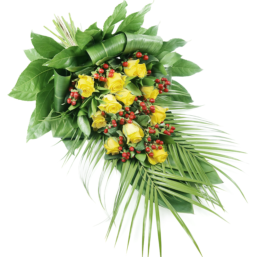 The combination of yellow roses and red hypericum was stunning. The bouquet provided great comfort.